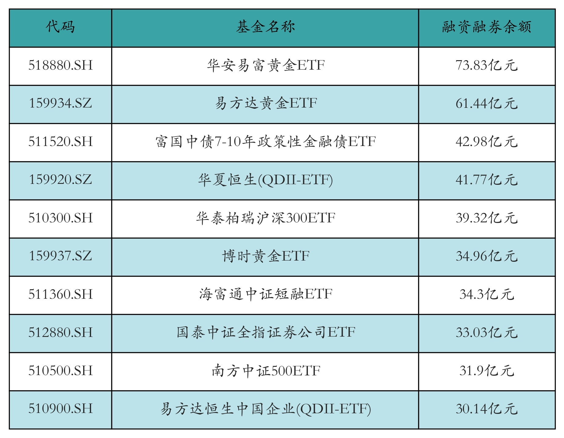 9月10日ETF两融余额前三位分别为:华安易富黄金ETF(73.83亿元)、易方达黄金ETF(61.44亿元)和富国中债7-10年政策性金融债ETF(42.98亿元),前10具体见下表: