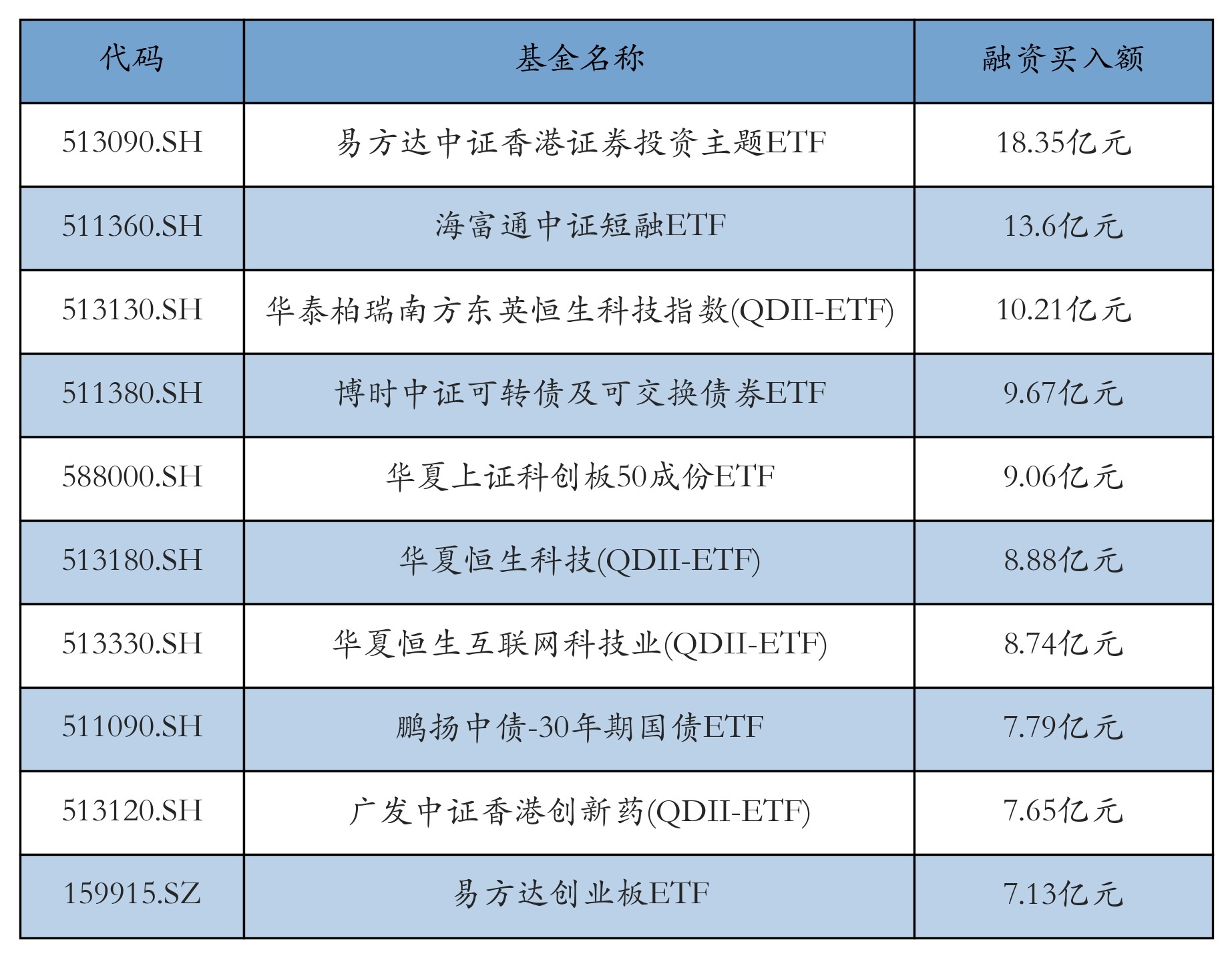 9月10日ETF融资买入额前三位分别为:易方达中证香港证券投资主题ETF(18.35亿元)、海富通中证短融ETF(13.6亿元)和华泰柏瑞南方东英恒生科技指数(QDII-ETF)(10.21亿元),前10具体见下表: