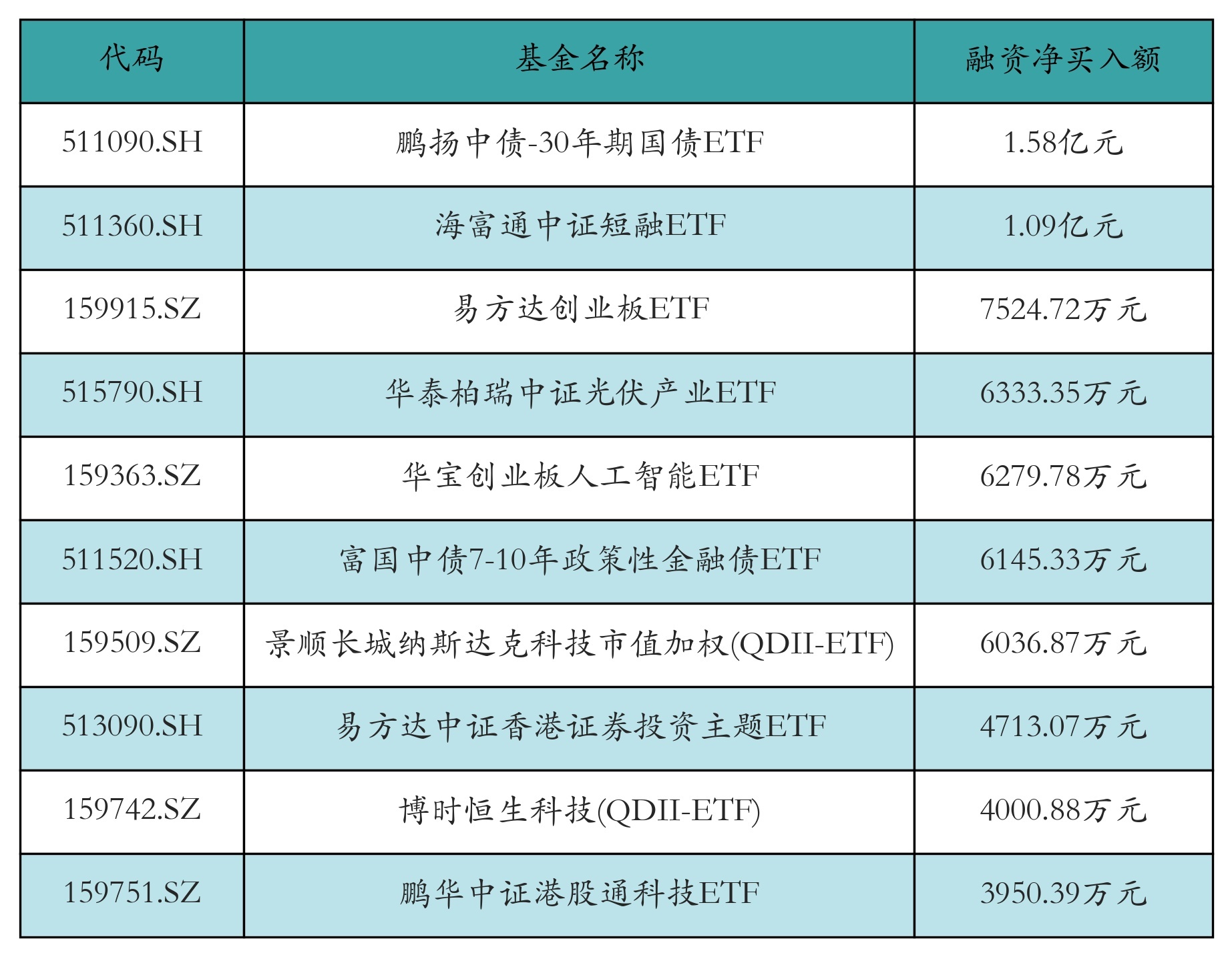 9月10日ETF融资净买入额前三位分别为:鹏扬中债-30年期国债ETF(1.58亿元)、海富通中证短融ETF(1.09亿元)和易方达创业板ETF(7524.72万元),前10具体见下表: